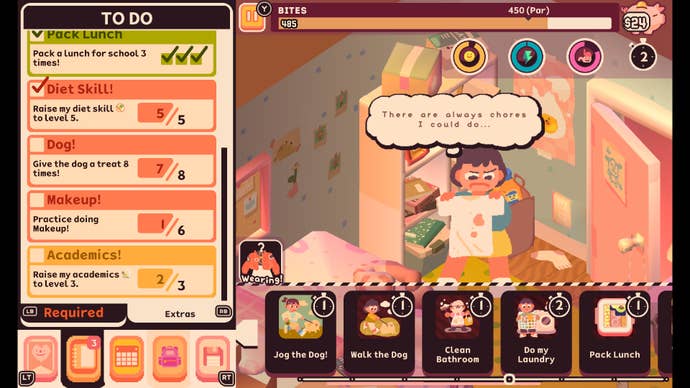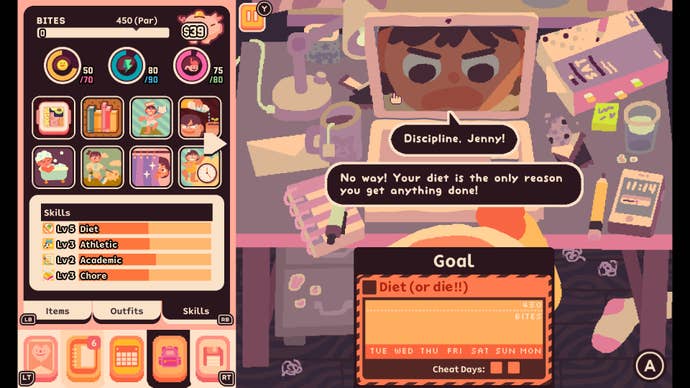 There’s a lot of this kind of design elegance throughout Consume Me, where experiences – and even emotions – are conveyed as much through gameplay as story. That’s most evident in its overarching framework of time management, where you’ll need to use Jenny’s limited free time as efficiently as possible in order to complete each chapter’s checklist of objectives. Early on, her responsibilities – studying, chores, and sticking to her diet – seem manageable enough, but with only a few hours of free time available each day, staying on top of things quickly become a tricky (and stressful) balancing act. One wrong move can have a dramatic knock-on effect; overeat, for instance, and suddenly you’ll need to spent a precious hour exercising to get back within your Bite limit. Then there’s the added complexity of your ever-dwindling mood, energy, and gut meters, all requiring diligent maintenance in order to avoid locking yourself out of critical activities. You can probably see where this is going.