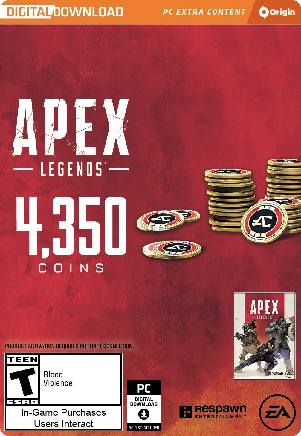Purchase Apex Coins to customize your character! This in-game currency can be used to purchase new cosmetic items for characters and weapons in the direct purchase shop. Apex Coins can also be used to purchase cosmetic Apex Packs and to unlock new characters through the in-game store. *Requires Apex Legends on applicable platform (sold separately) and all game updates. The EA terms of sale govern your use of apex coins. Other conditions and restrictions apply.