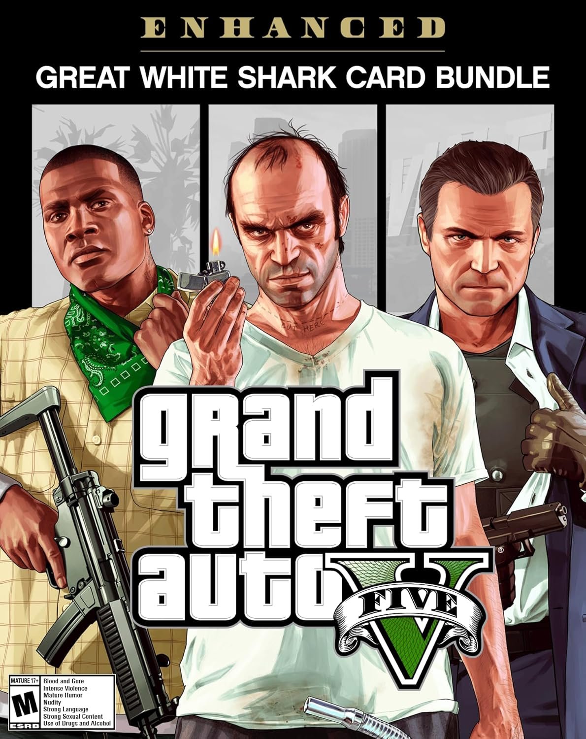 The Grand Theft Auto V: Premium Edition & Great White Shark Card Bundle includes the complete Grand Theft Auto V story experience, free access to the ever evolving Grand Theft Auto Online and all existing gameplay upgrades and content including The Cayo Perico Heist, The Diamond Casino & Resort, The Diamond Casino Heist, Gunrunning and much more. You’ll also get the Criminal Enterprise Starter Pack, the fastest way to jumpstart your criminal empire in Grand Theft Auto Online, plus a Great White Shark Cash Card worth $1,250,000 in-game GTA dollars to spend in GTA Online. GRAND THEFT AUTO V When a young street hustler, a retired bank robber and a terrifying psychopath land themselves in trouble, they must pull off a series of dangerous heists to survive in a city in which they can trust nobody, least of all each other. GRAND THEFT AUTO ONLINE Discover an ever-evolving world of choices and ways to play as you climb the criminal ranks of Los Santos and Blaine County in the ultimate shared Online experience. THE CRIMINAL ENTERPRISE STARTER PACK The Criminal Enterprise Starter Pack is the fastest way for new GTA Online players to jumpstart their criminal empires with the most exciting and popular content plus $1,000,000 bonus cash to spend in GTA Online – all content valued at over GTA$10,000,000 if purchased separately. LAUNCH YOUR CRIMINAL EMPIRE Launch business ventures from your Maze Bank West Executive Office, research powerful weapons technology from your underground Gunrunning Bunker and use your Counterfeit Cash Factory to start a lucrative counterfeiting operation. A FLEET OF POWERFUL VEHICLES Tear through the streets with a range of 10 high performance vehicles including a Supercar, Motorcycles, the weaponized Dune FAV, a Helicopter, a Rally Car and more. You’ll also get properties including a 10 car garage to store your growing fleet. WEAPONS, CLOTHING & TATTOOS You’ll also get access to the Compact Grenade Launcher, Marksman Rifle and Compact Rifle along with Stunt Racing Outfits, Biker Tattoos and more.