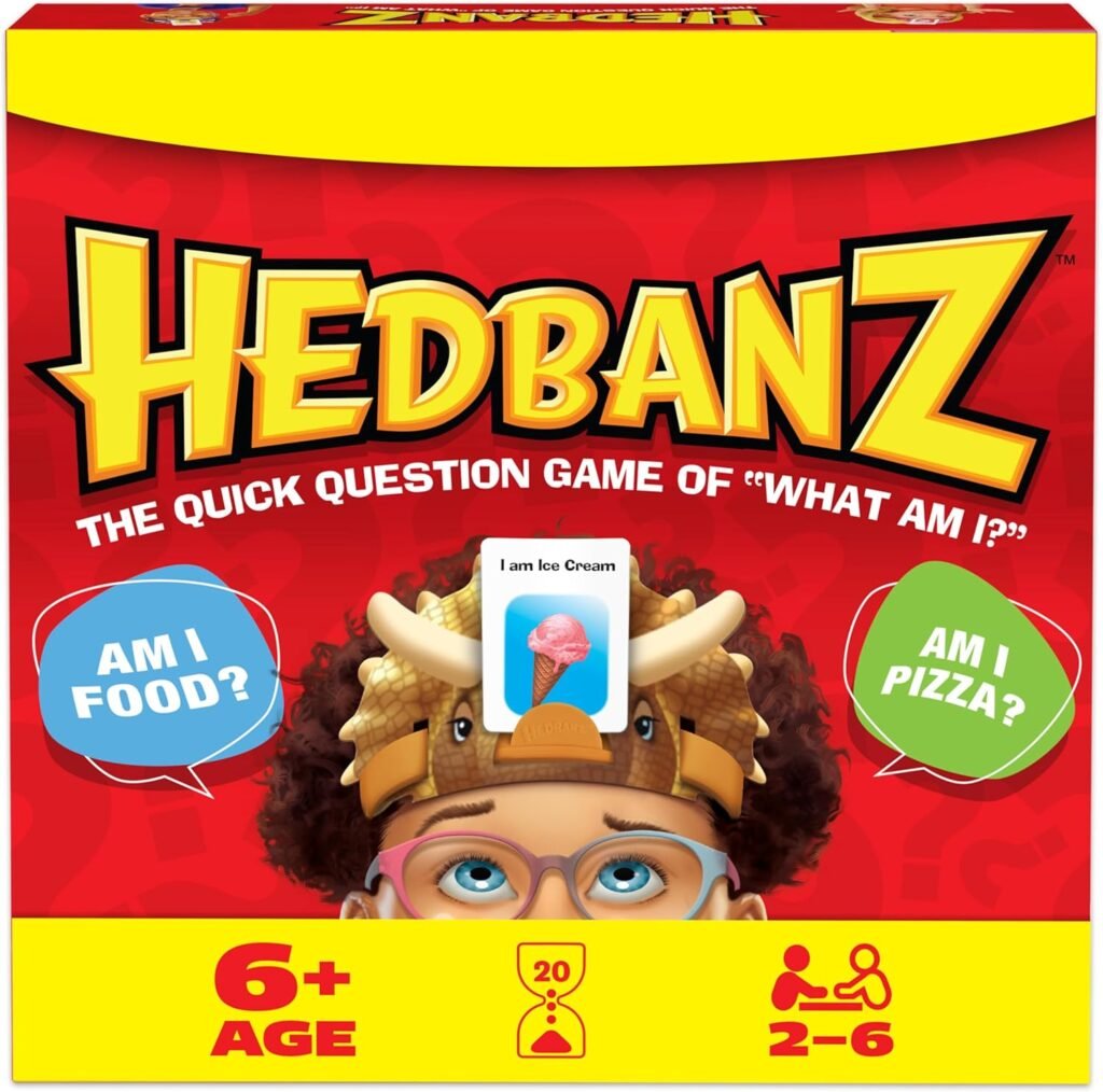 Family Game Night: Hedbanz is a must-have in your collection of family games for kids and adults. It is for everyone ages 6 and up. For 2-6 players, bring along when you are in need of fun board games for family night