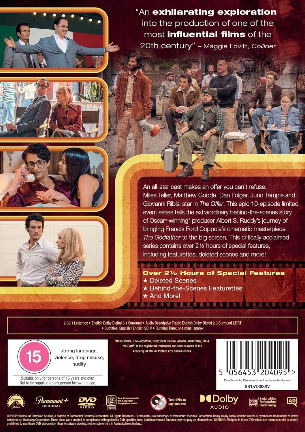 An all-star cast makes an offer you can’t refuse. Miles Teller, Matthew Goode, Dan Folger, Juno Temple and Giovanni Ribisi star in The Offer. This epic 10-episode limited event series tells the extraordinary behind-the-scenes story of Oscar®-winning* producer Albert S. Ruddy’s journey of bringing Francis Ford Coppola’s cinematic masterpiece The Godfather to the big screen. This critically acclaimed series contains over 2 ½ hours of special features, including featurettes, deleted scenes and more! Over 2½ Hours of Special Features • Deleted Scenes • Backstories • Crafting The Offer Wardrobe & Costume Design • Crafting The Offer Music Composition • Crafting The Offer Production Design • Crafting The Offer Prop Design • Crafting The Offer Hair & Makeup Design • Meet Al Ruddy • Directing The Offer • Parallels: Art Imitates Art • The Offer: Sending a Message • No One Can Refuse: Making The Offer